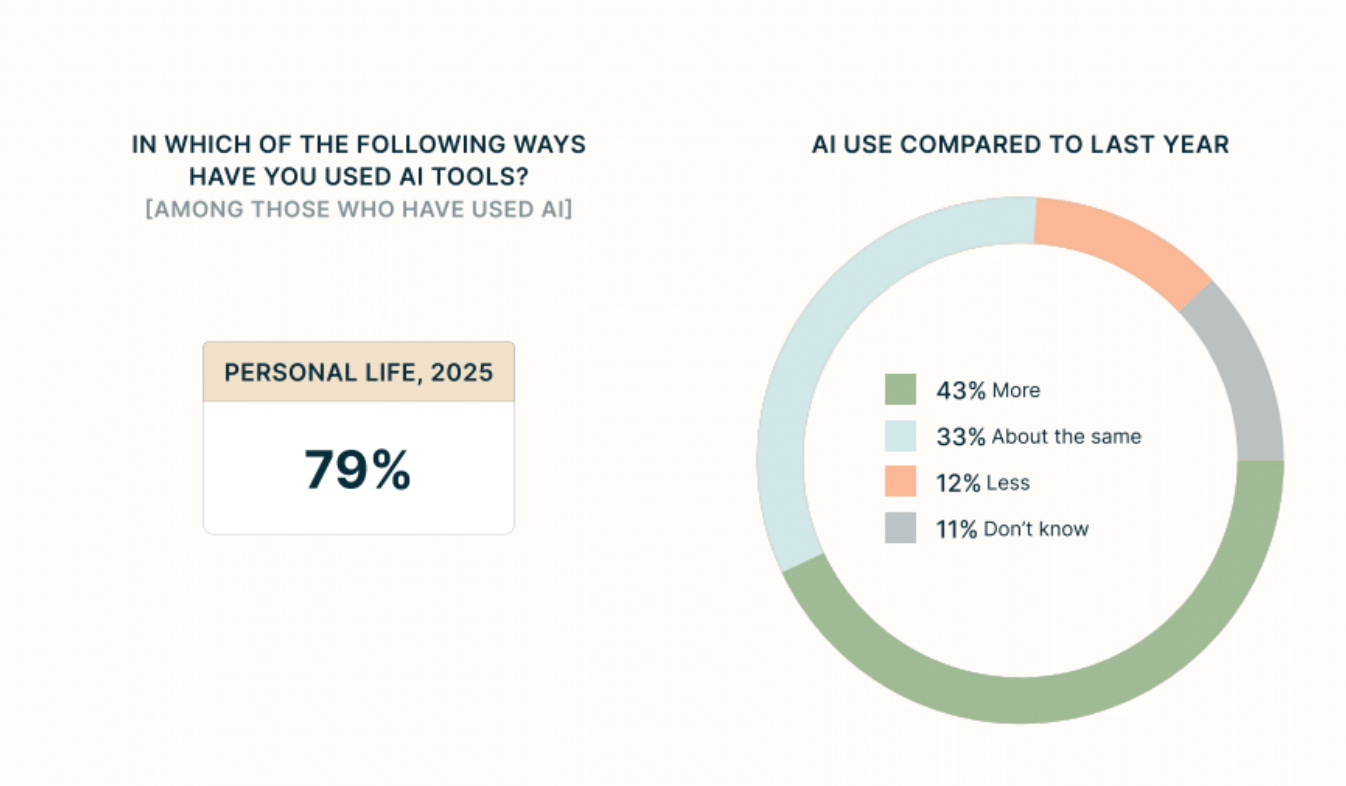 And adoption looks set to grow: 43% of Americans report using AI more this year than last.