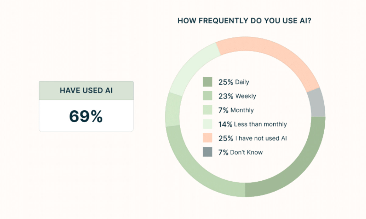 Awareness only tells part of the story. What’s striking is how deeply AI has embedded itself in daily life – and how quickly. Nearly seven in ten Americans now report having used AI. A full quarter use it daily.