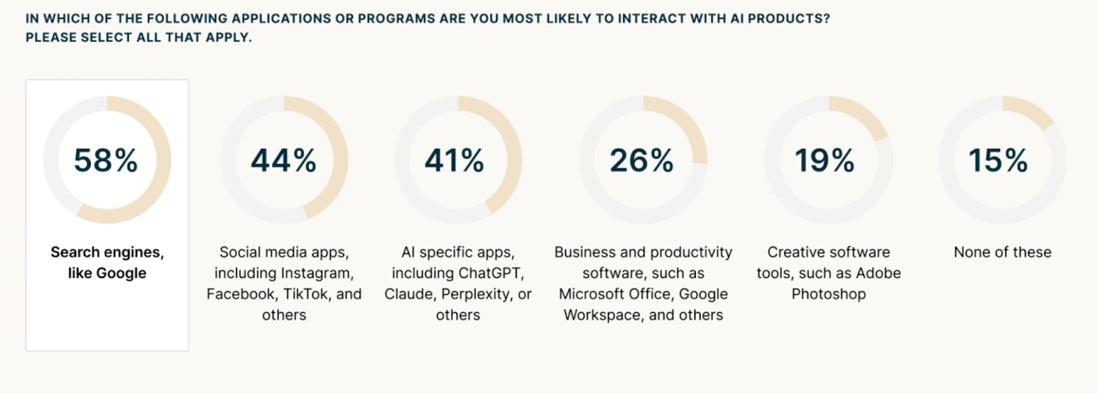 A lot of this use comes from a nearly invisible integration of AI into other technologies. When we asked people where they interact with AI, 58% said through search engines like Google. Another 44% encounter it on social media. Only 41% deliberately open ChatGPT, Claude, or similar tools.