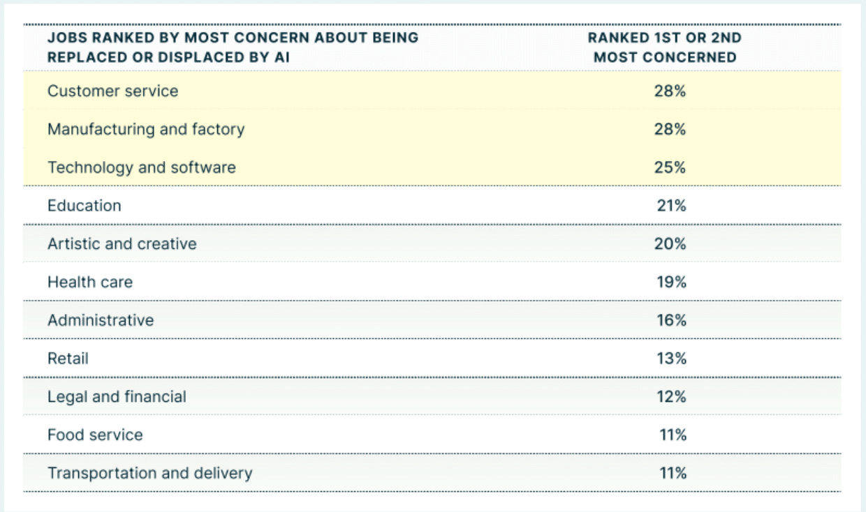 The specific job concerns span multiple sectors. Customer service roles top the worry list at 28%, alongside technology jobs (25%) and manufacturing (28%). Even creative fields register 20% concern.