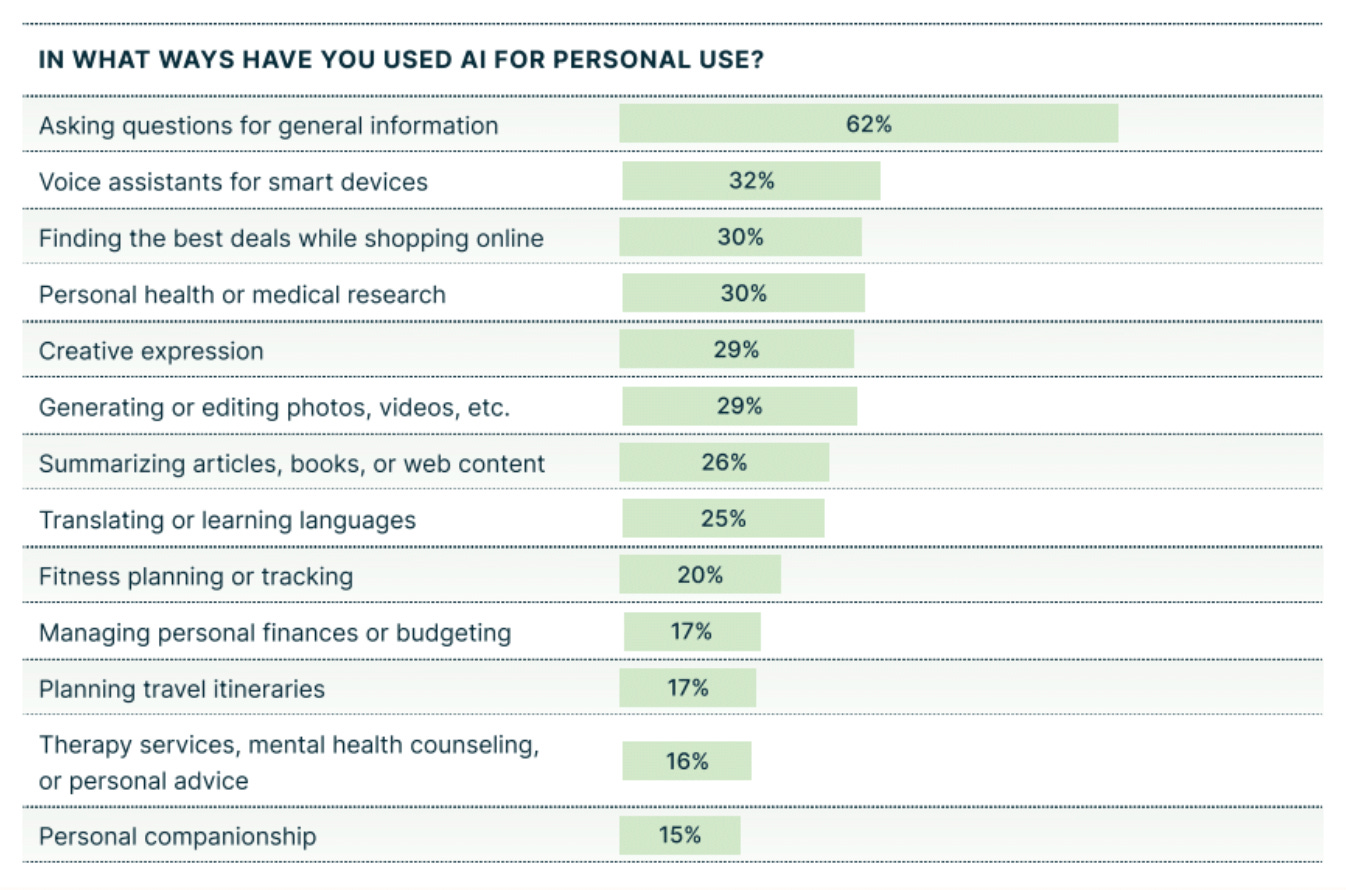The picture is clear: nearly everyone is using AI to some degree. But if we dig deeper, we see that people are not using AI for radically new applications: 62% use it for asking questions and getting information, essentially treating it as a supercharged search engine.