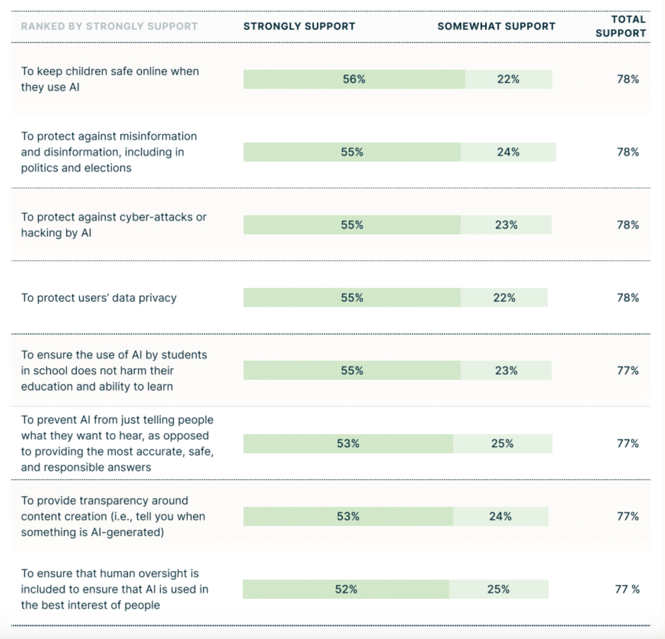 More than 75% support establishing protections around children’s safety online, combating misinformation in politics and elections, preventing cyber-attacks, protecting data privacy, ensuring AI use in education doesn’t harm learning, and maintaining human oversight. These are substantial demands that command supermajority support across party lines.
