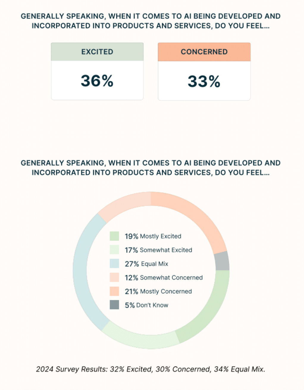 Americans are getting more excited about AI – but only marginally. Over the past year, public excitement has climbed from 32% to 36%, while concern rose from 30% to 33%. If you just look at the numbers, optimism is winning. But the gap is narrow. And what’s perhaps most revealing: 27% of Americans sit squarely in the middle, equally excited and concerned.