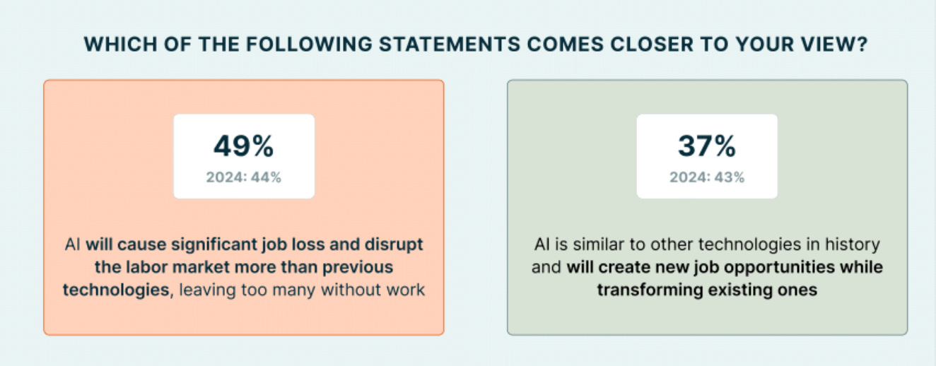 On the employment front, nearly half of Americans (49%) believe AI will cause significant job displacement. Only 37% believe it will create new opportunities while transforming existing roles. This is a major shift from the year before, when the public was split on the future impact of AI on jobs.