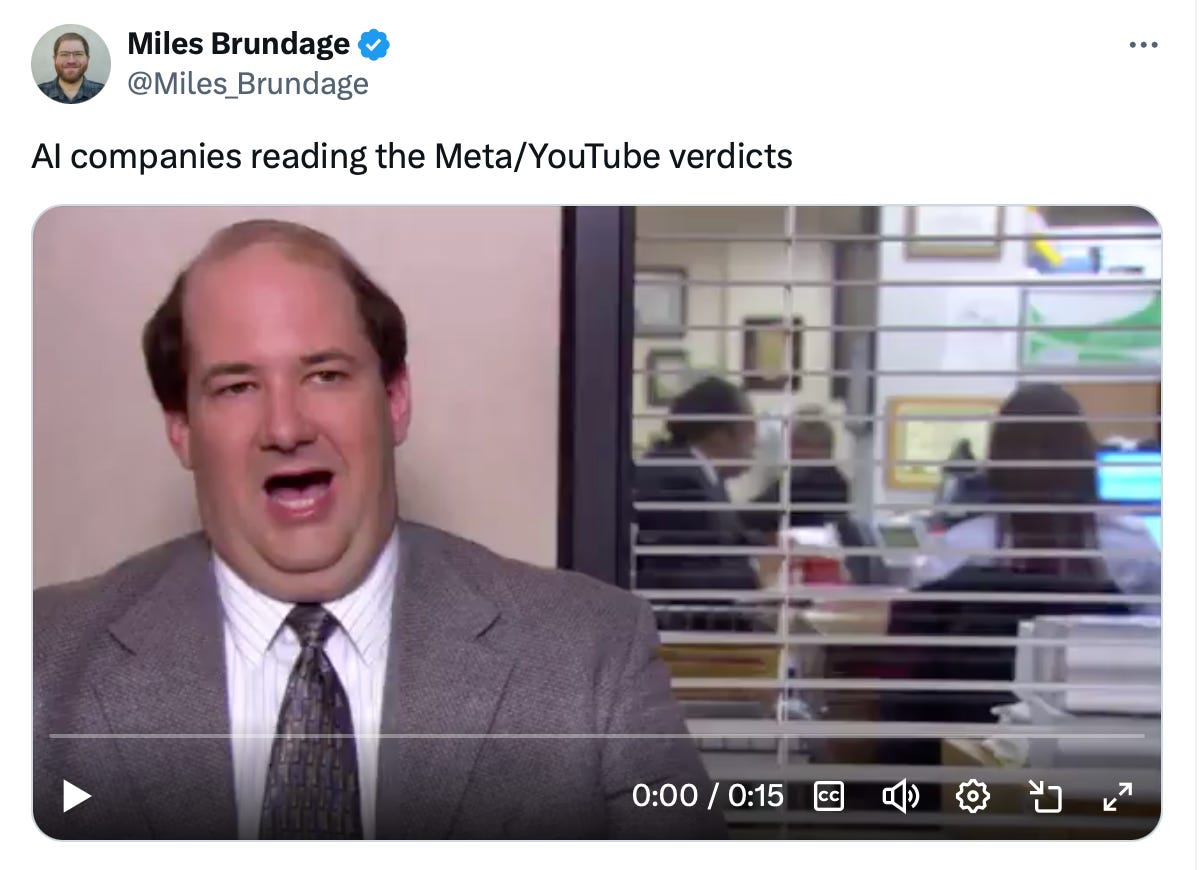 This week’s verdicts are both a watershed and a warning. Without a proactive, expert-led system to define what reasonable care looks like, and to update that definition as the technology evolves, we will be left with a patchwork of jury verdicts that may provide emotional catharsis, a liability cost that will be baked into the sector, but far too little practical guidance that actually prevents bad societal outcomes.